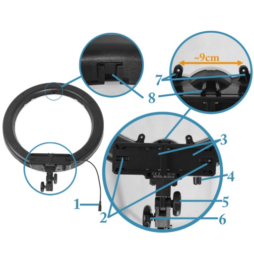 Łatwy montaż na statywie studyjnym ze standardową końcówką 16 mm umożliwia regulowane ramię z pokrętłami blokującymi pozycję, zapewniając komfortową pracę z lampą. Wewnętrzna powierzchnia odbijająca pozwala na dużą wydajność świecenia, a kształt okręgu sprawia, że fotografowany obiekt oświetlony jest równomiernie ze wszystkich stron i nie trzeba dostarczać innych źródeł światła.