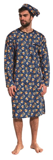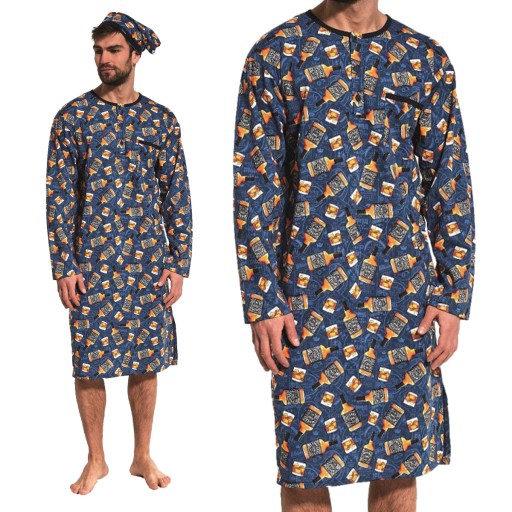 Komfortowa koszula męska dla indywidualistów. Wykonana z wysokogatunkowej dzianiny. Długi rękaw. półokrągły dekolt, rozpinany na 3 guziki. Dodatkowo kieszonka na piersi, oraz u dołu 2 rozporki. W zestawie czapeczka.