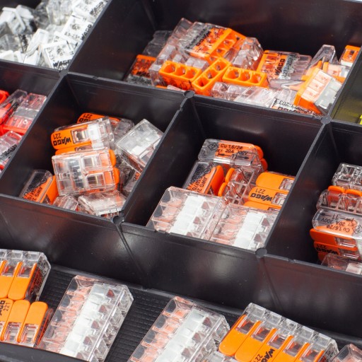 Komplet szybkozłączek instalacyjnych WAGO przeznaczonych do łączenia przewodów jednodrutowych (tzw. drut) oraz wielodrutowych (tzw. linka).