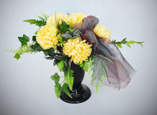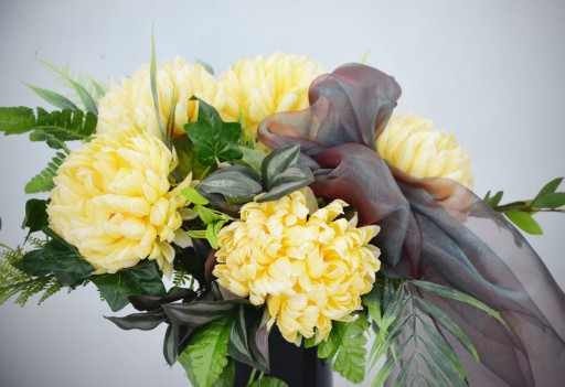 - 5 dużych chryzantem w kolorze delikatnego żółtego, które do złudzenia przypominają żywe kwiaty,