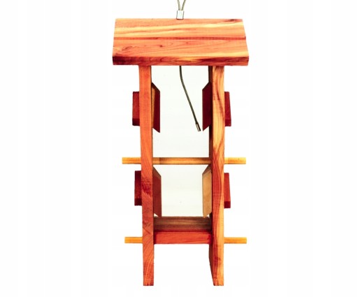 Karmidło jest zbudowane z wysokiej jakości drewna cedrowego, które jest odporne na warunki atmosferyczne, dodatkowo zawiera szybki ze szkła akrylowego, dzięki czemu można kontrolować ilość pokarmu w karmniku.