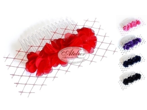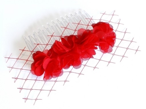 Grzebyk z bezbarwnego tworzywa ozdobiony woalką i delikatnymi szyfonowymi kwiatkami.