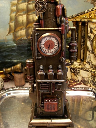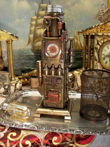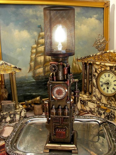 Zapraszam do zakupu niezwykłej lampy z zegarkiem w stylu steampunk.Lampa przypomina jakąś niezwykłą, parową maszynę z XIX wieku, której jedynym celem jest zasilanie zegara i lampy.Przenosi nas w czasie do okresu niezwykłych wynalazków, literatury fantastycznej Juliusza Verna.Fantastycznie się prezentuje do tego jest nie tylko nietuzinkowym gadżetem, ale daje nastrojowe światło i wskazuje czas.Przedmiot jest precyzyjnie wykonany z poliresinu, pokryty brązem, ręcznie malowany.