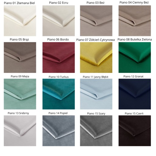 Tkaniny obiciowe PIANO Wysokiej jakości tkanina obiciowa Piano z powłoką hydrofobową ułatwiająca utrzymanie w czystości. Z tkaniny schodzą plamy po kawie, winie, czekoladzie, a nawet ślady po długopisie, dzięki czemu materiał tapicerski na dłużej zachowuje czystość i świeżość. Gęsto tkany miękki w dotyku włos z subtelnym połyskiem. Idealna dla osób ceniących sobie wygodę, komfort oraz praktyczne rozwiązania. Tkanina idealna na meble.