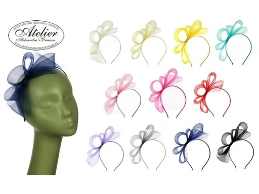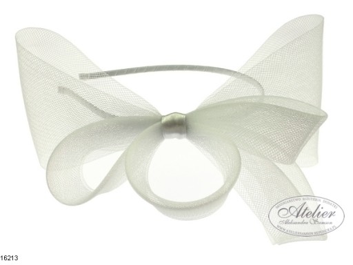 Satynowa opaska ozdobiona stroikiem z syntetycznej krynoliny. Opaska jest na metalowej podstawie, dzięki czemu można ją dopasować do kształtu głowy. Opaska bez ząbków. Jest to produkt szyty (nieprzyklejany).