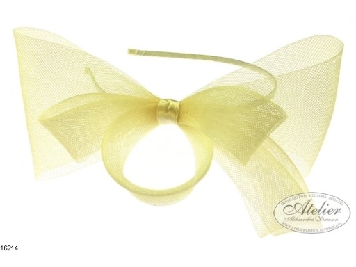 Satynowa opaska ozdobiona stroikiem z syntetycznej krynoliny. Opaska jest na metalowej podstawie, dzięki czemu można ją dopasować do kształtu głowy. Opaska bez ząbków. Jest to produkt szyty (nieprzyklejany).