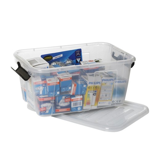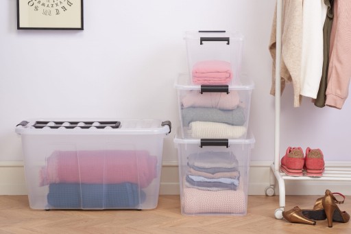 Seria klasycznych pudełek do przechowywania z serii Home. Przezroczysty dół. Pokrywę przytrzymują dwa mocne klipsy, zapewniając solidne jej zamocowanie. Do rowków na powierzchni pokrywki pasują idealnie wypustki znajdujące się na dnie pudła, co zapobiega przesuwaniu się pudeł ustawionych w stos. Różne rozmiary, od 1,5 do 85 L.
