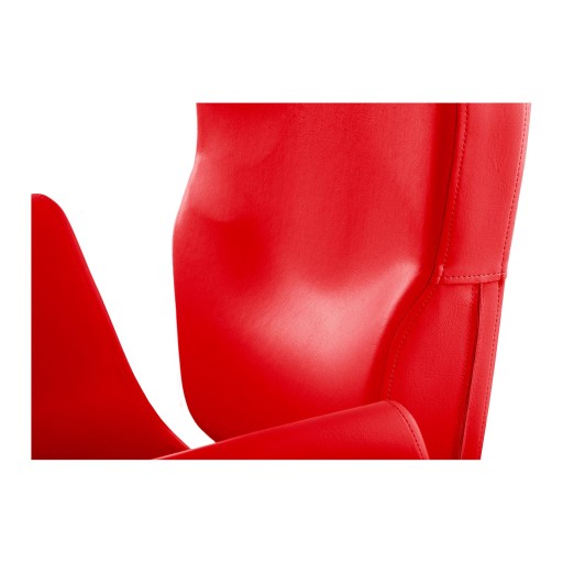 Konstrukcja fotela wykonana została z wytrzymałej stali. Siedzisko, wypełnione odporną na trwałe odkształcenia pianką, pokryto elegancką i miękką w dotyku skórą ekologiczną w kolorze czerwonym, która dobrze komponuje się z chromowanymi elementami szkieletu. Tapicerka jest wodoodporna, dzięki czemu łatwo ją utrzymać w czystości.