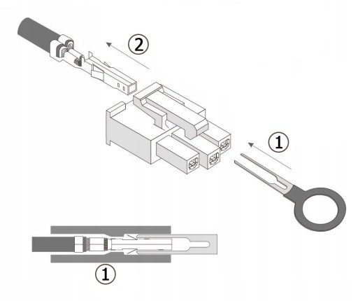 - Trzymając wciśnięty wyjmak delikatnie wyciągnij przewód.
