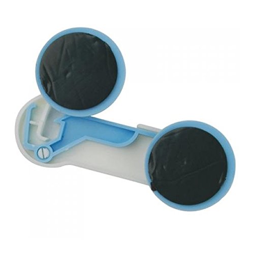 Sztywna blokada wykonana z trwałego tworzywa. Montowana do mebli za pomocą samoprzylepnej dwustronnej taśmy piankowej przymocowanej na odwrocie zabezpieczenia. Otwiera się po wciśnięciu niebieskiego elementu w białym "haczyku" i uniesieniu do góry.