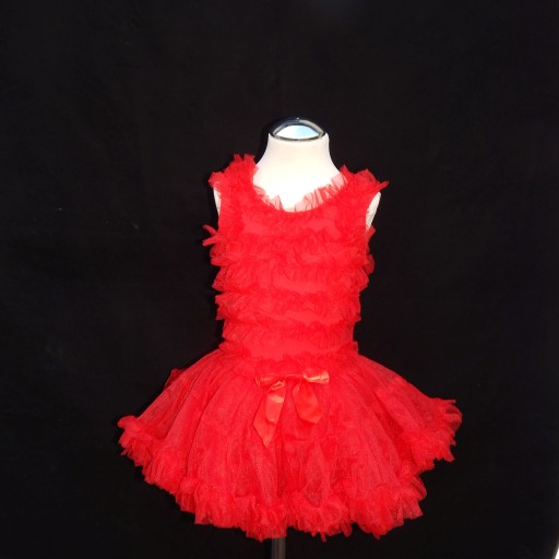 - W pasie kokarda, 3 suto marszczone falbany, zakończone małymi falbaneczkami, pięknie unoszą cały dół sukienki.