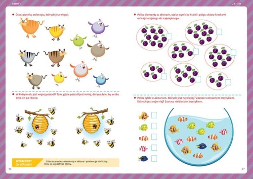Książka wychodzi od prostych zadań na zbiorach, kształcących umiejętność rozróżniania stron (prawo – lewo) oraz porównywania, wyodrębniania i łączenia całości, przez naukę kolejnych cyferek, aż do podstaw dodawania, odejmowania, mnożenia i dzielenia. Każda strona została zaopatrzona w dodatkowe informacje dla dorosłego, wyjaśniające, czego uczą zadania na niej i jak można pomóc maluchowi, by rozwiązanie zadań przyszło mu jeszcze łatwiej.