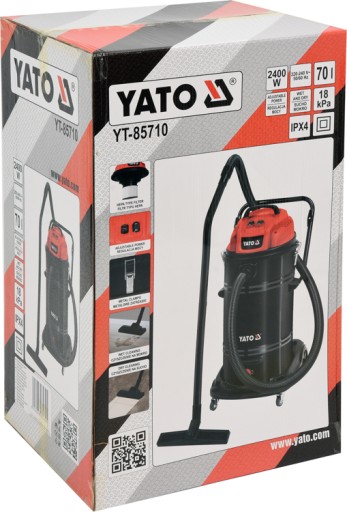 Odkurzacz przemysłowy YATO o mocy 2400 W i mocy ssanie 18 kPa.