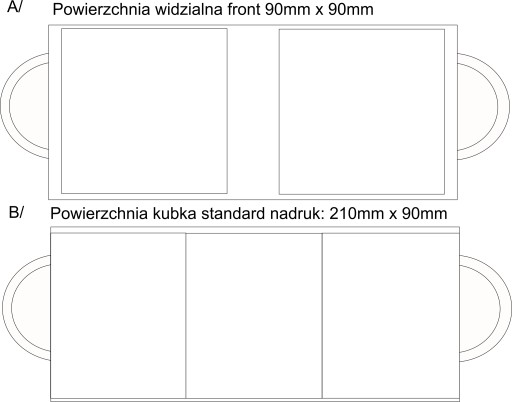 Pamiętaj, że powierzchnia eksponowana kubka ( czyli ta widzialna ) to środek każdej z trzech części rysunku B, przy czym należy miec na względzie, że kubek stoi najczęściej bokiem, a więc dlatego główny obraz/logo umieszczamy na środku każdej z dwóch części rysunku A.