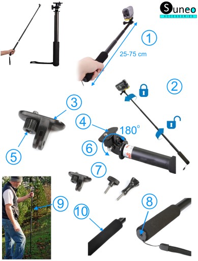 - Poszczególne moduły systemu teleskopowego zostały wyposażone w specjalne zabezpieczenie przed niechcianym złożeniem monopodu - ich przekręcenie w lewo powoduje ich stabilne zablokowanie na dowolnej długości. Odblokowanie następuje po przekręceniu w prawo.