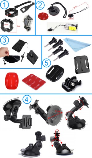 - 5 adapterów (głowic) z mocowania GoPro na mocowanie Sony Action Cam (3 rodzaje)