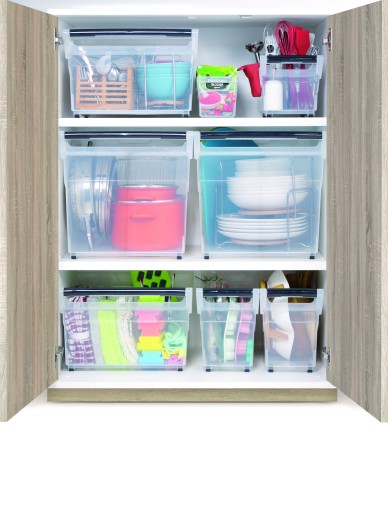 Pojemniki służą jako schowek na drobiazgi, akcesoria szkolne i biurowe, nierzadko ogromną ilość zabawek i dziecięcych bibelotów. Ułatwią sortowanie przedmiotów codziennego użytku, produktów spożywczych i chemii gospodarczej. W kuchennej szafce pod zlewem taki system wewnętrznej organizacji zapewni szybki i łatwy dostęp do chemikaliów, zapobiega rozlaniu się płynnych substancji, środków do dezynfekcji, detergentów.