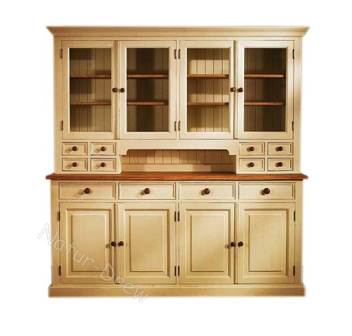 - Kredens Drewniany Składa się z dwóch części -nadstawki i komody oddzielonej od siebie blatem.Nadstawka Kredensu posiada 12 szuflad wysuwanych na rolkowych Prowadnicach ,natomiast pod blatem znajdują sie cztery zamykane szafki. a u góry przeszklone frony z pólkami w środku .Całość wzbogacają zawiasy imitujące stare złoto i ręcznie robione gałki