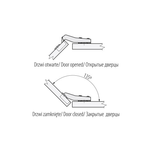 Produkt zawiera: Zawias równoległy kątowy 45°, Prowadnik H-0 CLIP-ON, Zaślepka na puszkę, Zaślepka na stopkę, Wkręty do drewna w zestawie