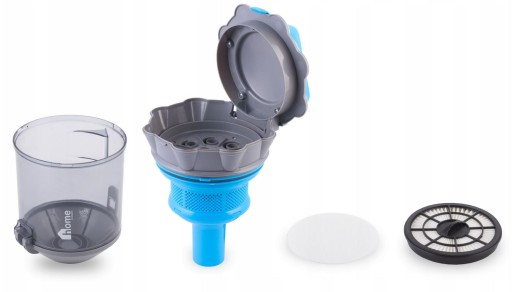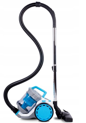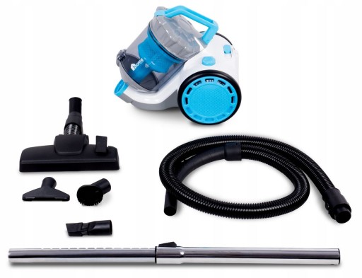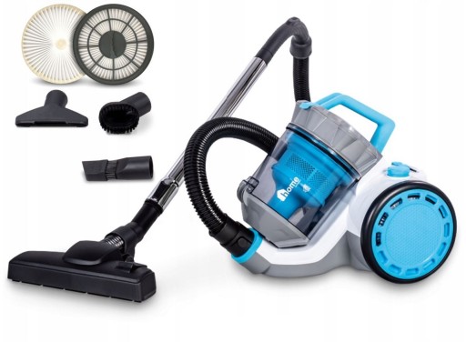 Nowy odkurzacz bezworkowy OVERMAX HOME ASPIRI POWER kolor niebieski , Metalowa chromowana rura teleskopowa , Elastyczna rura z tworzywa sztucznego , Nakładka do podłóg i dywanów , Nakładka szczelinowa 2 w 1 , Okrągła nakładka ze szczotką , Nakładka do podłóg twardych , 2 filtry HEPA wielokrotnego użytku Oryginalne opakowanie z serii HOME