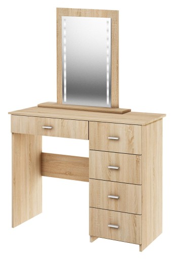 Toaletka V z lustrem LED, to idealna propozycja dla każdej kobiety! W komfortowych warunkach zadbasz o swoją urodę, a pięć szufladek pomieści nie tylko wszystkie kosmetyki, ale także perfumy czy biżuterię. Oświetlenie ledowe o neutralnej barwie światła, umożliwi Ci wykonanie perfekcyjnego makijażu. Lustro jest wolnostojące, możesz zatem ustawić je w wybranym przez siebie miejscu (należy przymocować je do blatu w przypadku, gdy toaletka nie stoi bezpośrednio przy ścianie). Ty zdecydujesz, jak zmontować toaletkę! Jest bowiem uniwersalna i możesz zmontować ją na prawą lub lewą stronę. Nie zwlekaj, stwórz swój własny kącik do makijażu i ciesz się komfortem!