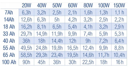 Przedstawiona obok tabela prezentuje czas potrzebny do naładowania dostępnych na rynku akumulatorów w zależności od mocy układu fotowoltaicznego.