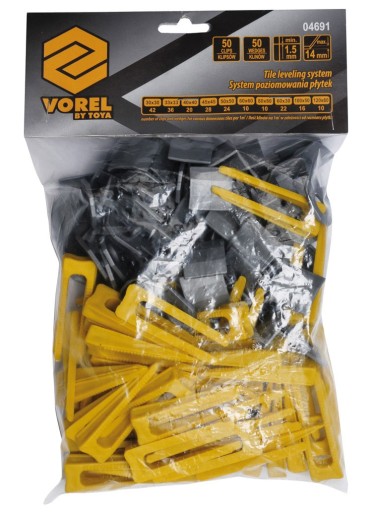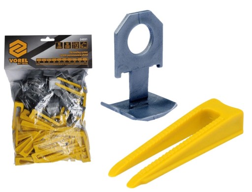 Nowoczesny system do poziomowania płytek, który w bardzo szybki i łatwy sposób pomaga ułożyć idealnie płytki oszczędzając czas i eliminując niedokładności powierzchni. Składa się z zestawu zrywalnych klipsów oraz klinów wielorazowego użytku, wykonanych z wysokogatunkowego tworzywa sztucznego. Zalety stosowanie systemu VOREL: - zastępuje wąskie krzyżyki - zapobiega przemieszczaniu podczas instalacji i wiązania kleju - przyśpiesza układanie płytek z zachowaniem idealnych fug i połączeń - brak potrzeby użycia dodatkowych narzędzi - można go stosować na ściany i podłogi - łatwy w montażu na każdym poziomie umiejętności