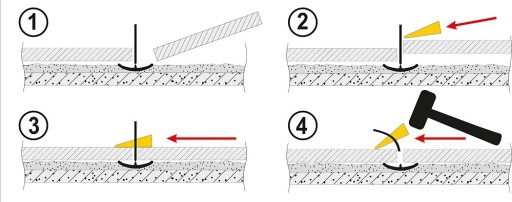 1. Po nałożeniu kleju włóż klipsy pod kafel tak, aby z każdej strony płytki znalazły się po 2 klipsy 2. Dosuń kolejną płytkę do klipsów. 3. Włóż klin w otwór klipsie i dociśnij aby wyrównać kafelki względem siebie. 4. Po zastygnięciu zaprawy (kleju) do glazury, usuwamy klips lekko go uderzając.