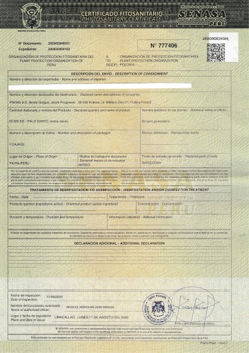 Oferowane na aukcji gałązki pochodzą z Peru, gdzie pozyskiwanie Świętego Drzewa jest regulowane przez peruwiański rząd, a legalnie działające firmy uzyskują odpowiednie certyfikaty (które posiadamy do wglądu). Wycinka drzew jest w Peru zakazana. Zbierane mogą być wyłącznie naturalnie obumarłe gałęzie i konary, pod odpowiednio długim czasie od ich naturalnego opadnięcia. Kupując na aukcji masz pewność, że drzewo pochodzi z legalnego źródła i zostało pozyskane w pełnej zgodności z naturą. Tylko drzewo pozyskane w powyższy sposób gwarantuje zachowanie swoich niezwykłych własności, za które jest tak szeroko cenione na całym świecie.