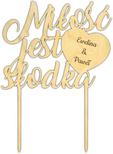 napis na tort "Miłość jest słodka" wraz z wygrawerowanymi imionami na serduszku
