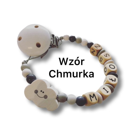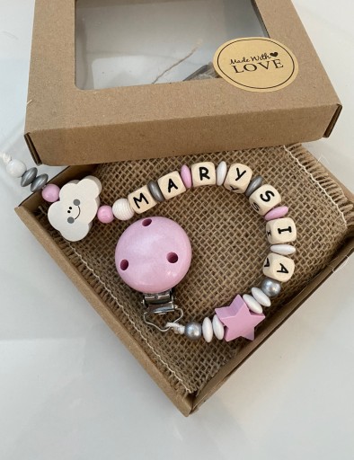 Drewniana spersonalizowana zawieszka do smoczków i gryzaków, świetnie sprawdzi się w domu i na spacerze, pozwoli zapobiec zgubieniu smoczka, gryzaka a nawet małego przyjaciela naszej pociechy.