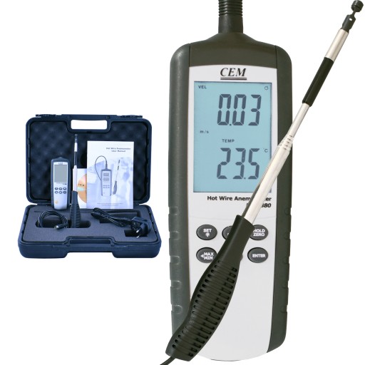 Profesjonalny miernik do pomiaru temperatury oraz przepływu powietrza (anemometr) specjalizowany do pomiaru niskich wartości przepływu. Wyposażony jest w sondę teleskopowa o długości 1,2m z elementem pomiarowym cieplno-oporowym na co pozwala na pomiar w miejscach trudno dostępnych. Duży czytelny wyświetlacz LCD umożliwia jednoczesne pokazanie wyników pomiaru prędkości (wydatku) oraz temperatury powietrza. Anemometr przeznaczony jest do precyzyjnego pomiaru prędkości powietrza i temperatury ciągów wentylacyjnych i nawiewowych. Miernik jest przystosowany do mocowania na statywie i wykonywania długotrwałych ciągłych pomiarów. Przyrząd jest zaopatrzony w port USB oraz program do komunikacji z komputerem. Urządzenie posiada funkcję obliczania wydajności przepływu w m³/minutę.