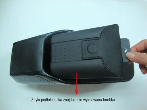 Z tyłu podłokietnika znajduje się wyjmowana torebka, którą możesz wsunąć za pasek w spodniach. Torebka zamykana jest za pomocą magnesu. Poniżej znajduje się plastikowy, mocny adapter dedykowany indywidualnie do każdego modelu samochodu.