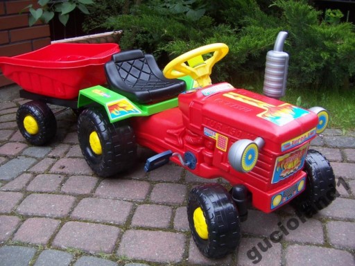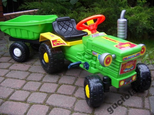 TRAKTOREK POSIADA NAPĘD NA PEDAŁKI ( Z MECHANIZMEM ŁAŃCUCHOWYM ) ORAZ SKRĘTNĄ KIEROWNICĘ, ZA POMOCĄ KTÓREJ DZIECKO KIERUJE CAŁYM ZESTAWEM !!!!