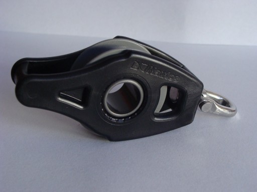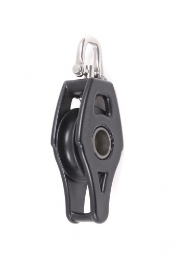 Łożyskowany pojedynczy bloczek 40 mm z krętlikiem i szeklą. Dzięki zastosowaniu otwartej osi aluminiowej z dużym otworem bloczek jest dużo lżejszy w porównaniu ze stalowym. Solidna jednorodna obudowa z kompozytu jest odporna na uderzenia i przecinanie, a nylonowa rolka uformowana w sposób zapewniający optymalne ułożenie liny