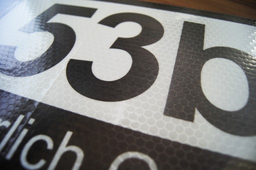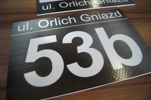 tabliczka pcv z dowolnymi danymi, którą można zamontować na elewacji, drzwiach czy bramie. Tabliczka pokryta jest odblaskową folią z systemem plastra miodu, która daje największy odblask.