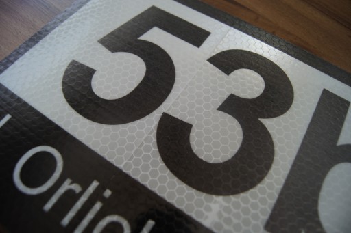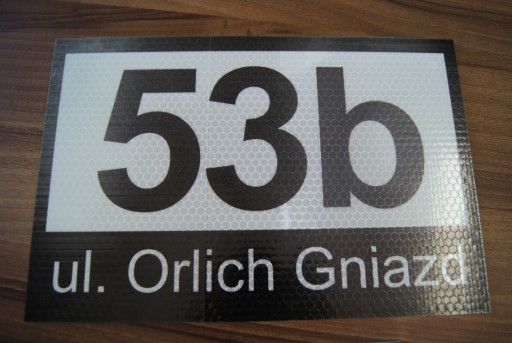 tabliczka pcv z dowolnymi danymi, którą można zamontować na elewacji, drzwiach czy bramie. Tabliczka pokryta jest odblaskową folią z systemem plastra miodu, która daje największy odblask.