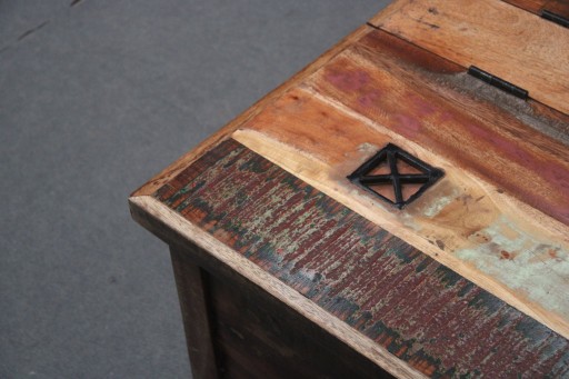 Ława / Skrzynia jest nowa. Seria wykonywana jest ręcznie w całości z Indyjskiego drewna recyclingowego. W głównej mierze wykorzystuje się takie drewno jak akacja i mango. Dzięki wyjątkowej fakturze drewna oraz różnorodnej kolorystyce wpasuje się w każdy wystrój i idealnie sprawdzi się w przedpokoju. Kolorystyka, metalowe wykończenia oraz struktura drewna (małe pęknięcia, dziury, nierówności, które są wykonywane celowo), podkreśla indywidualność mebla.