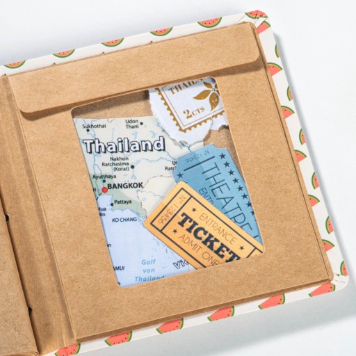 - Miejsce na wspomnienia: zachowaj pasujące pamiątki związane z Twoimi zdjęciami, takie jak bilety, pocztówki, w zintegrowanej kopercie
