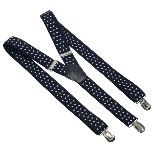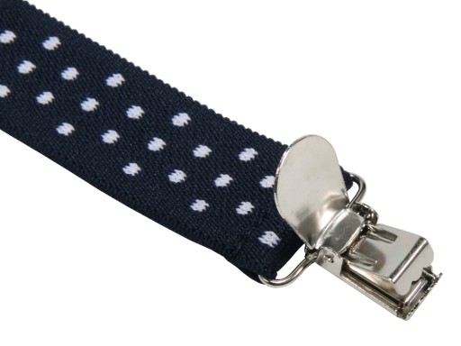 Metalowe klamry mocno trzymają spodnie.