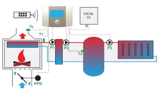Regulator utrzymuję temperaturę spalin na bezpiecznym poziomie. Zamyka przepustnicę po procesie palenia, co zapobiega wychładzaniu kominka. Regulator steruje również pracą pomp obiegowych instalacji BUFORA w funkcji różnicy temperatur. Realizuje dodatkowe funkcje, takie jak np. wyłączenie dodatkowego kotła.Obsługa regulatora została przemyślana w taki sposób, aby była maksymalnie prosta i intuicyjna. Wszystkie funkcje regulatora ustawiane są tylko jednym pokrętłem(system TOUCH & PLAY).