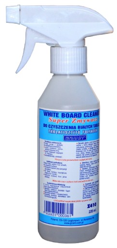 Płyn idealnie usuwa z powierzchni tablicy wszelkie zabrudzenia i pozostałości po markerach, pozostawiając ją śnieżnobiałą.