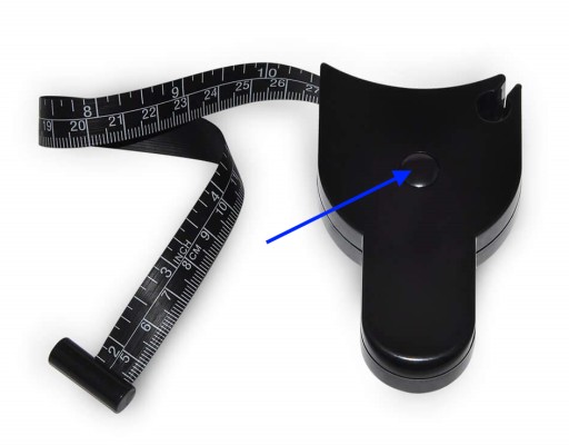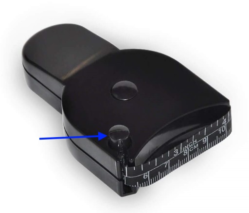 - Naciśnij przycisk zwijający miarkę w celu najlepszego dopasowania miarki do mierzonej części ciała.