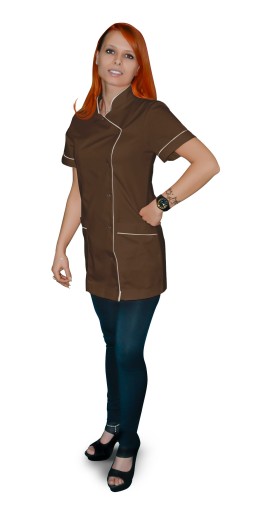 Fartuch ten jest zapinany na napy i ma przód wykończony stójką. To daje nam możliwość wywinięcia na dekolcie.