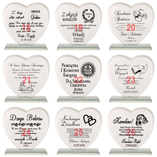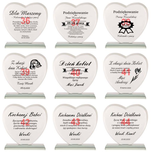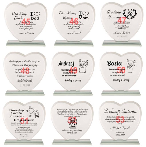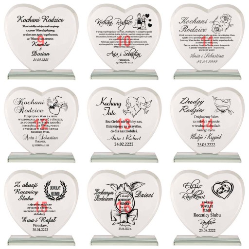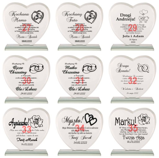 Masz problem z podjęciem decyzji jaki prezent wybrać na podziękowania dla rodziców? Idziesz na rodzinną imprezę i nie wiesz co kupić jubilatowi / solenizantowi? Kup ten produkt! Jest to kryształowa statuetka w kształcie serca z pięknym bordowym etui. Ma szlifowane boki i kanty aby prezentować się jeszcze piękniej. Kryształ ma grubość aż 19 mm! Ponadto jest grawerowany na wysokiej jakości ploterze laserowym, a grawer jest ręcznie i bardzo dokładnie wypełniany przez rzemieślnika specjalną farbą. Złocenie / srebrzenie mieni się pod światło i daje niesamowity efekt. Wszystko dopełnia piękne bordowe etui z bordową satyną w którym statuetka prezentuje się jeszcze piękniej, a złocenie uwydatnia się.