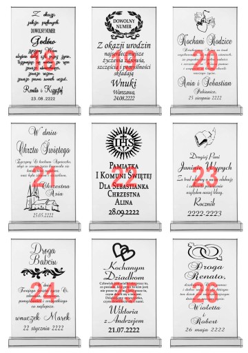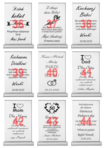 Masz problem z podjęciem decyzji jaki prezent wybrać na podziękowania dla rodziców? Idziesz na rodzinną imprezę i nie wiesz co kupić jubilatowi / solenizantowi? Kup ten produkt! Jest to szklana statuetka w kształcie prostokąta z pięknym bordowym etui. Ma szlifowane boki i kanty aby prezentować się jeszcze piękniej. Statuetka ma grubość aż 12 mm! Ponadto jest grawerowana na wysokiej jakości ploterze laserowym, a grawer jest ręcznie i bardzo dokładnie wypełniany przez rzemieślnika specjalną farbą. Złocenie / srebrzenie mieni się pod światło i daje niesamowity efekt. Wszystko dopełnia piękne bordowe etui z bordową satyną w którym statuetka prezentuje się jeszcze piękniej, a złocenie uwydatnia się.