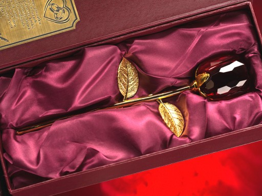 Masz problem z podjęciem decyzji jaki prezent wybrać na podziękowania dla rodziców? Idziesz na rodzinną imprezę i nie wiesz co kupić jubilatowi / solenizantowi? Kup teraz tą różę. Jest to wykonana z bordowego kryształu ręcznie szlifowana i formowana głownia do której dołączona jest metalowa malowana na złoto łodyga na której widoczne jest bardzo wiele szczegółów. Dodatkowo w zestawie jest grawerowany stojak z dedykacją, aby róża mogła pięknie prezentować się na honorowym miejscu w każdym domu. Wszystko dopełnia sztywne bordowe etui z bordową satyną również z grawerowaną dedykacją oraz zdjęciem