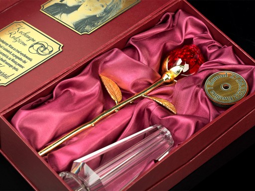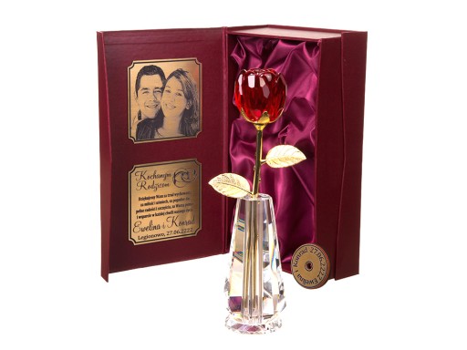 Masz problem z podjęciem decyzji jaki prezent wybrać na podziękowania dla rodziców? Idziesz na rodzinną imprezę i nie wiesz co kupić jubilatowi / solenizantowi? Kup teraz tą różę. Jest to wykonana z bordowego kryształu ręcznie szlifowana i formowana głownia do której dołączona jest metalowa malowana na złoto łodyga na której widoczne jest bardzo wiele szczegółów. Dodatkowo w zestawie jest grawerowany stojak z dedykacją, aby róża mogła pięknie prezentować się na honorowym miejscu w każdym domu. Wszystko dopełnia sztywne bordowe etui z bordową satyną również z kryształowym wazonem oraz grawerowanym zdjęciem.