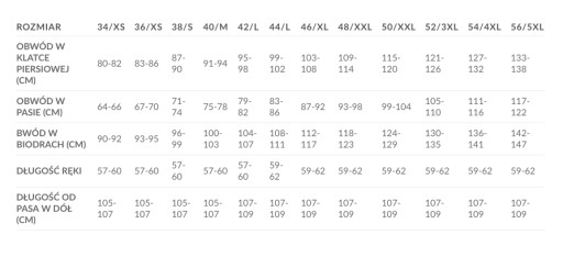 Podane w tabeli wymiary są orientacyjne. Pomiar robiony bezpośrednio na rozłożonych na płasko kombinezonach. Tolerancja błędu wynosi +- 1-2 cm.