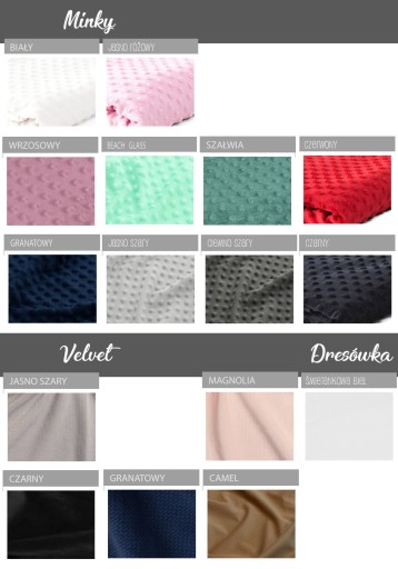 W każdym wariancie od środka istnieje możliwość dopasowania różnych tkanin: minky, dresówka, velvet, bawełna.